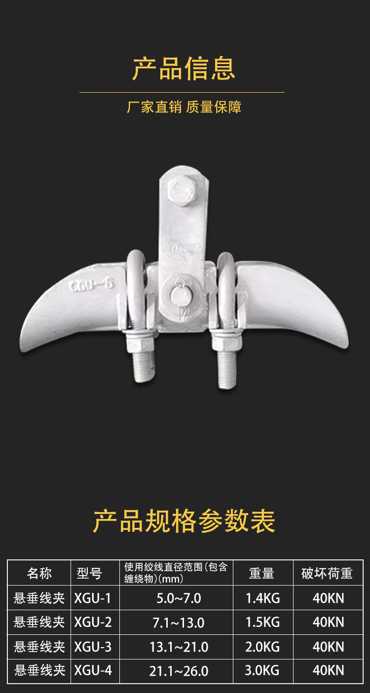 1)、懸吊金具。又稱支持金具或懸垂線夾。這種金具主要用來懸掛導線絕緣 子串上(多用于直線桿塔)及懸掛跳線于絕緣子串上。下圖是懸垂線夾。